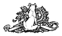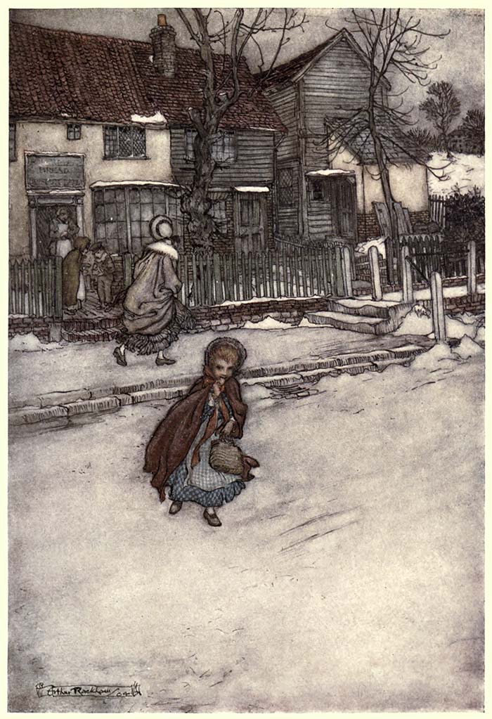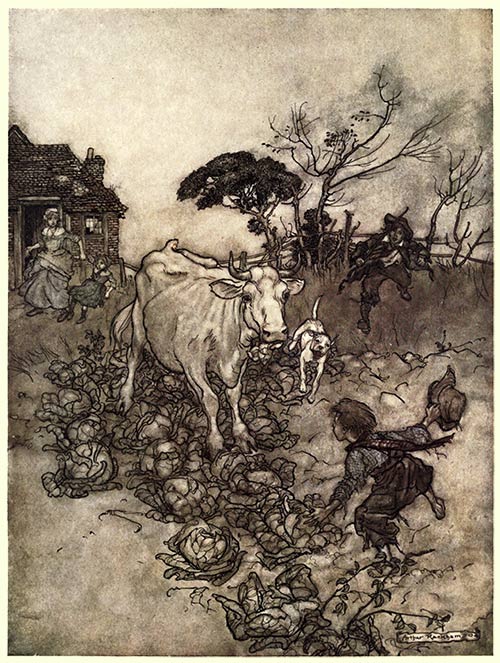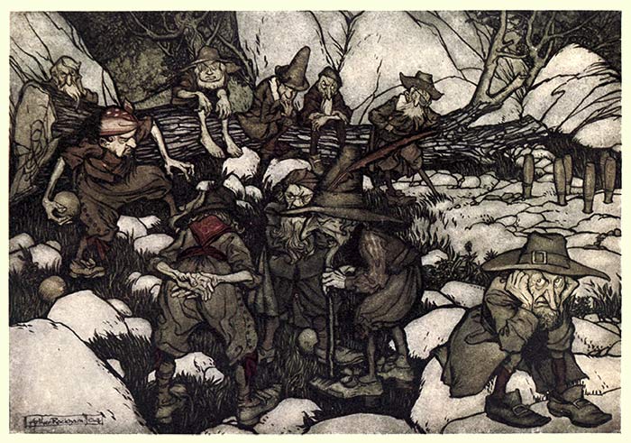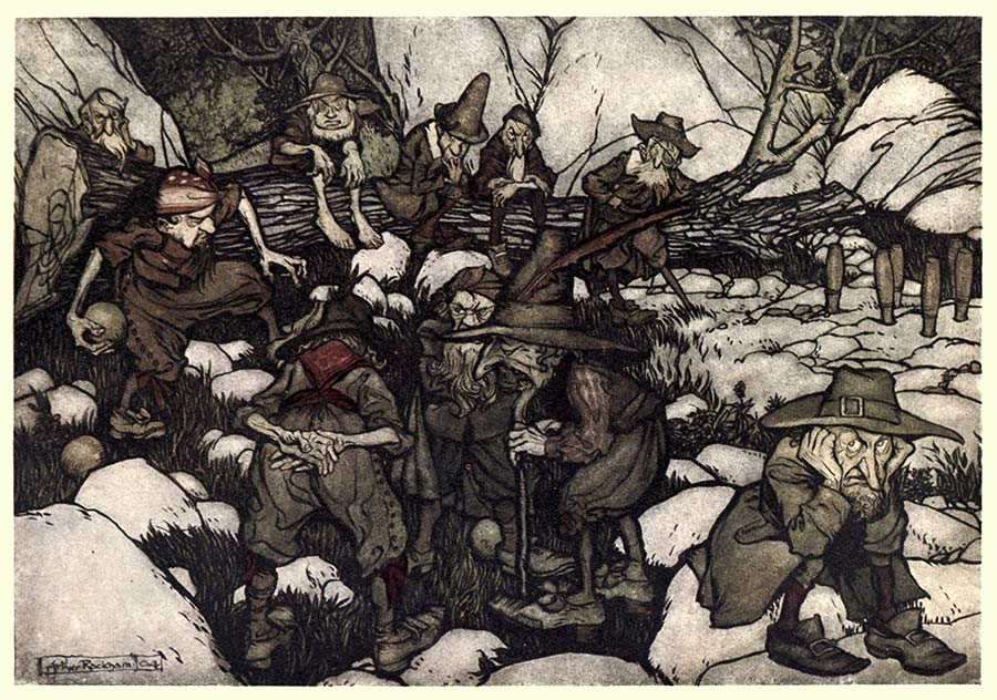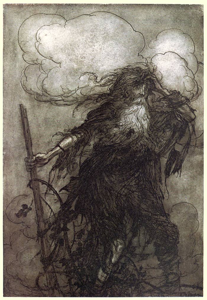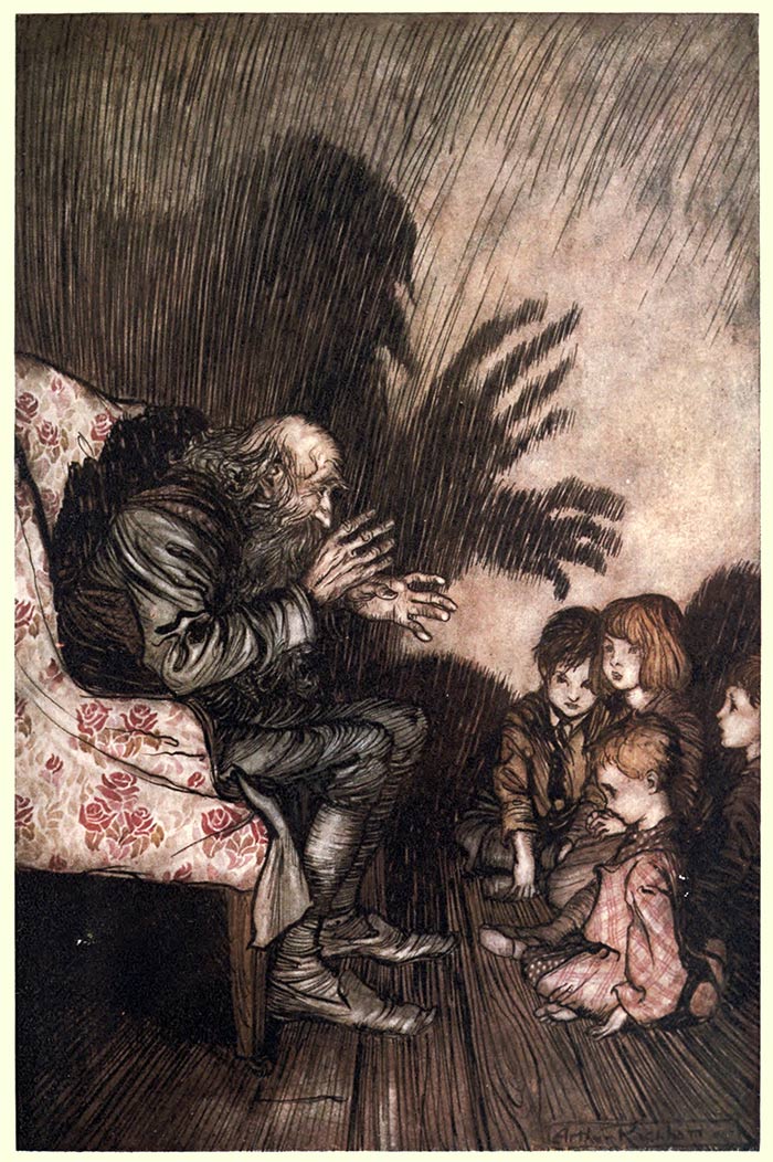 Rip’s sole domestic adherent was his dog Wolf, who was as much hen-pecked as his master; for Dame Van Winkle regarded them as companions in idleness, and even looked upon Wolf with an evil eye, as the cause of his master’s going so often astray. True it is, in all points of spirit befitting an honourable dog, he was as courageous an animal as ever scoured the woods—but what courage can withstand the evil-doing and all-besetting terrors of a woman’s tongue? The moment Wolf entered the house his chest fell, his tail drooped to the ground or curled between his legs, he sneaked about with a gallows air, casting many a sidelong glance at Dame Van Winkle, and at the least flourish of a broomstick or ladle he would fly to the door with yelping precipitation.