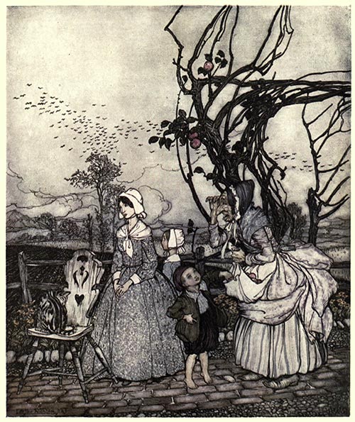 The bystanders began now to look at each other, nod, wink significantly, and tap their fingers against their foreheads. There was a whisper, also, about securing the gun, and keeping the old fellow from doing mischief, at the very suggestion of which the self-important man in the cocked hat retired with some precipitation. At this critical moment a fresh, comely woman pressed through the throng to get a peep at the grey-bearded man. She had a chubby child in her arms, which, frightened at his looks, began to cry. “Hush, Rip,” cried she, “hush, you little fool; the old man won’t hurt you.” The name of the child, the air of the mother, the tone of her voice, all awakened a train of recollections in his mind. “What is your name, my good woman?” asked he.21