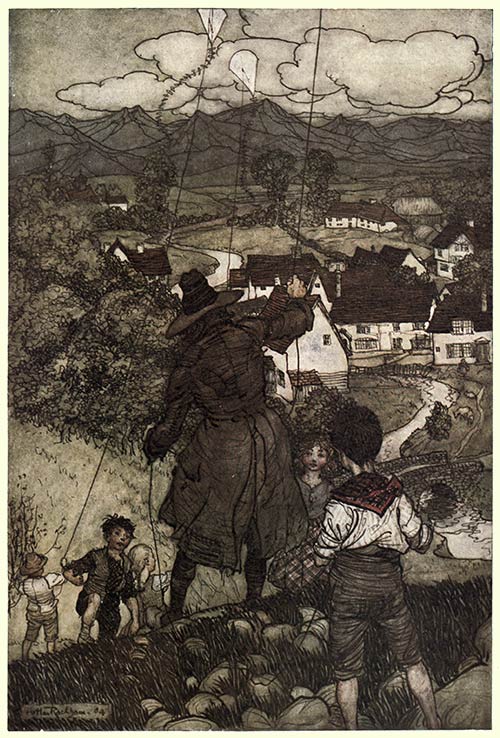 He had now entered the skirts of the village. A troop of strange children ran at his heels, hooting after him, and pointing at his grey beard. The dogs, too, not one of whom he recognised for an old acquaintance, barked at him as he passed. The very village was altered; it was larger and more populous. There were rows of houses which he had never seen before, and those which had been his familiar haunts had disappeared. Strange names were over the doors—strange faces at the windows—everything was strange. His mind now misgave him; he began to doubt whether both he and the world around him were not bewitched. Surely this was his native village, which he had left but the day before. There stood the Kaatskill Mountains—there ran the silver Hudson at a distance—there was every hill and dale precisely as it had always been. Rip was sorely perplexed. “That flagon last night,” thought he, “has addled my poor head sadly!”