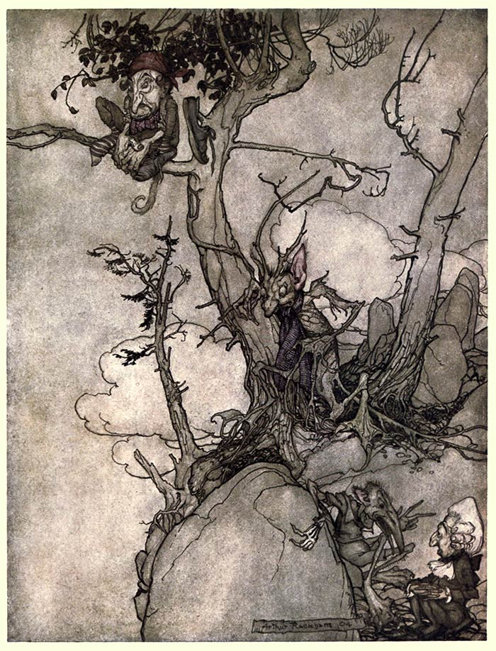 On nearer approach he was still more surprised at the singularity of the stranger’s appearance. He was a short, square-built old fellow, with thick bushy hair, and a grizzled beard. His dress was of the antique Dutch fashion: a cloth jerkin strapped round the waist—several pair of breeches, the outer one of ample volume, decorated with rows of buttons down the sides, and bunches at the knees. He bore on his shoulder a stout keg, that seemed full of liquor, and made signs for Rip to approach and assist him with the load. Though rather shy and distrustful of his new12 acquaintance, Rip complied with his usual alacrity; and mutually relieving one another, they clambered up a narrow gully, apparently the dry bed of a mountain torrent. As they ascended, Rip every now and then heard long, rolling peals, like distant thunder, that seemed to issue out of a deep ravine, or rather cleft, between lofty rocks, toward which their ragged path conducted. He paused for an instant, but supposing it to be the muttering of one of those transient thunder-showers which often take place in mountain heights, he proceeded. Passing through the ravine, they came to a hollow, like a small amphitheatre, surrounded by perpendicular precipices, over the brinks of which impending trees shot their branches, so that you only caught glimpses of the azure sky and the bright evening cloud. During the whole time Rip and his companion had laboured on in silence; for though the former marvelled greatly what could be the object of carrying a keg of liquor up this wild mountain, yet there was something strange and incomprehensible about the unknown, that inspired awe and checked familiarity.
