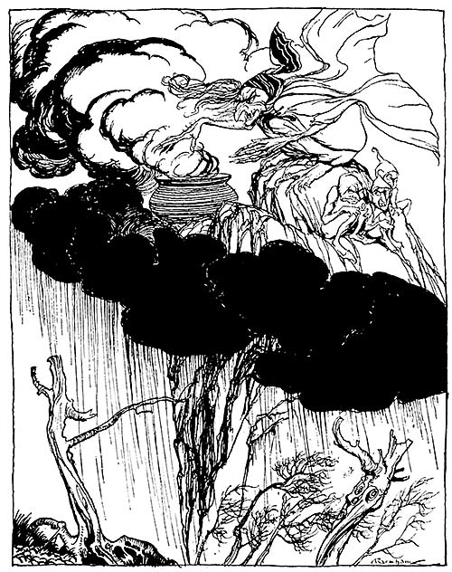 The Kaatsberg or Catskill mountains have always been a region full of fable. The Indians considered them the abode of spirits, who influenced the weather, spreading sunshine or clouds over the landscape, and sending good or bad hunting seasons. They were ruled by an old squaw spirit, said to be their mother. She dwelt on the highest peak of the Catskills, and had charge of the doors of day and night to open and shut them at the proper hour. She hung up the new moons in the skies, and cut up the old ones into stars. In times of drought, if properly propitiated, she would spin light summer clouds out of cobwebs and morning dew, and send them off from the crest of the mountain, flake after flake, like flakes of carded cotton, to float in the air, until, dissolved by the heat of the sun, they would fall in gentle showers, causing the grass to spring, the fruits to ripen, and the corn to grow an inch an hour. If displeased, however, she would brew up clouds black as ink, sitting in the midst of them like a bottle-bellied spider in the midst of its web; and when these clouds broke, woe betide the valleys!33