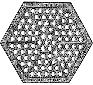 Few patents have conferred a greater blessing on society than that of which the accompanying cut is an illustration. The misery which was closely akin to area gratings, as used in “our grandfather’s day,” may yet be remembered by some not very old readers. Then light had to be admitted from the sidewalk without trespassing on the right of way by encroachment, and the manner in which that object was attained was by the use, invariably, of open iron gratings, which, whilst they admitted the light in bar sinister, as our heraldric authorities would say, did not offer any opposition to the falling dirt of the street which resolved itself alternately into dust or mud, according to the relative condition of the weather. The very palpable consequence of such a state of things was, that all areas under sidewalks were an accumulative nuisance which had to be borne if day-light was desirable in underground places.