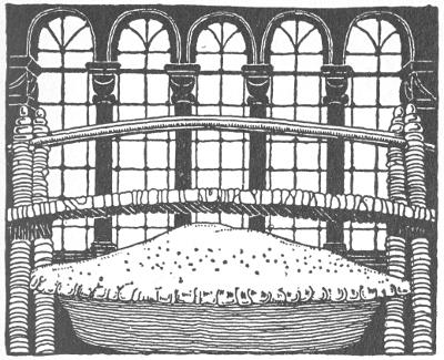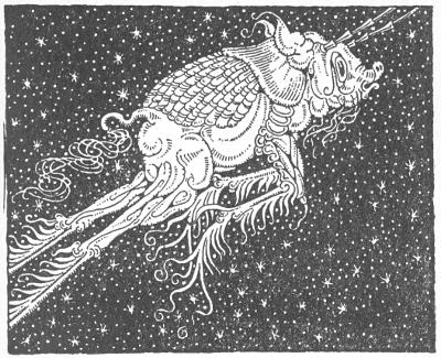 At last they drew up beside an enormous[144] chamber illuminated by points of light set like diamonds in the deep blue of a vaulted ceiling, to give the effect of stars. Snythergen was overjoyed when he saw his bed. Actually it was several feet longer than he was. For once he would not have to sleep twisted up in a circle, but could lie full length like any one else.