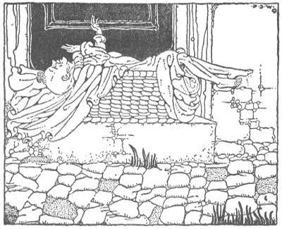 What could he do? He tried to think of a scheme while collecting his books. Bending over to pick up his slate pencil, he placed his head between his heels, just for the fun of it. And this gave him an idea! With his head still in this position, he bent his body into a circle making a hoop of himself. Then he began to[8] roll down hill across the fields, slowly at first, then faster and faster, then so fast he could not stop. He bounded over fences and ditches, until, all out of breath and very much flushed, he found himself at the school house door! This short cut saved him at least a mile, and it was such fun rolling down hill, he went that way every morning thereafter, rolling up to the door just as the school-bell was ringing—to crawl into the passage on his hands and knees.