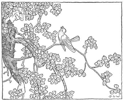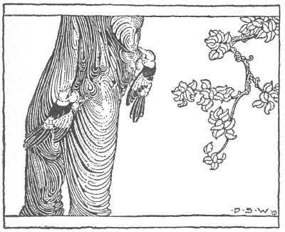 Snythergen went straight to the forest and very early the next morning dressed in his suit of green and took his place as a tree. For a long time he stood very still, holding his branches out and waving his leaves in the breeze. “I wish something would happen,” he said to himself. “It certainly bores one to be a tree.” He had been standing there since daybreak and the sun was now high in the sky. The birds as yet had not lighted on him. Some instinct made them hesitate. At last a daring woodpecker approached his trunk, and began a series of sharp pecks. Snythergen stifled an “ouch” and made a wry face. The first woodpecker was followed by others. They attacked his bark until it itched and smarted all over. In spite of his discomfort he tried to stand very still for he thought it beneath a tree’s dignity to show its feelings.