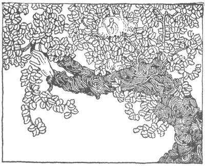 Unfortunately Snythergen was ticklish and whenever the birds touched a sensitive spot he could not help wiggling. This frightened the woodpeckers for a while and they flew to a neighboring limb to gaze at the strange tree. But as soon as they stopped tickling Snythergen always stopped shaking. This puzzled the birds. They could not understand why they felt the tree shake when they pecked, but could not see it move when they stopped to look at it. Finally they decided that they only imagined it moved, and after that they did not fly away unless the wiggling was very violent—which it was whenever a bird happened to blunder upon Snythergen’s “funny bone.” Snythergen was beginning to realize that the life of a tree is not all joy. Hardly could he wait for night to come when the birds would fly away. In the meantime he tried and tried to think of a plan to outwit them. “I have it!” he whispered to himself at last.