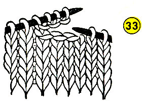 around neck and armholes is usually done with smaller needles. Hold the work with right side toward you and work from right to left. Insert right needle into the first st from edge, pick up stitches (Ill. No. 32). When picking up stitches on an irregular edge be sure to pick up a stitch in every row. Always work with the right side toward you unless otherwise directed.
