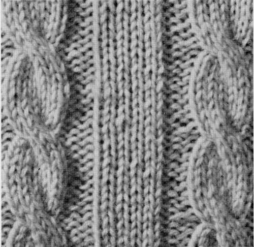 Cast on 35 sts. 1st ROW: K 3, P 3, K 6, P 3, K 5, P 3, K 6, P 3, K 3. 2nd ROW: P 3, K 3, P 6, K 3, P 5, K 3, P 6, K 3, P 3. Repeat last 2 rows 3 times. 9th ROW: K 3, P 3, sl next 3 sts on d p n and hold in front of work, K next 3 sts, K 3 sts from d p n (cable twist), P 3, K 5, P 3, cable twist, P 3, K 3. 10th ROW: Repeat 2nd row. NEXT 8 ROWS: Repeat 1st and 2nd rows 4 times. Repeat from 9th row for pattern.