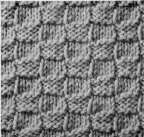 Cast on 35 sts. 1st ROW: K across row. 2nd ROW: K 1, * yarn in back of work, sl 1 as if to P, K 1, repeat from * across row. 3rd ROW: K 1, * yarn to front, sl 1 as if to P, K 1, repeat from * across row. 4th ROW: K across row. Repeat these 4 rows for pattern.