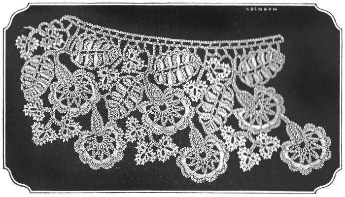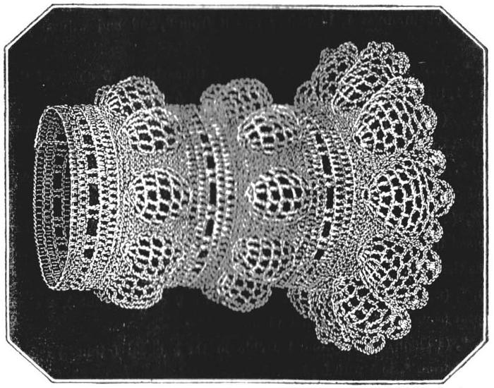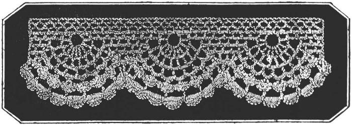 7th.—Edge; 3 chain, miss 2, 1 plain, 5 chain, miss 11, 1 plain, work a round loop, 5 chain, miss 11, 1 plain, (5 chain, miss 1, and 1 plain 5 times), 5 chain, miss 11, 1 plain, work a round loop, 5 chain, miss 11, 1 plain, 3 chain, miss 2, edge.