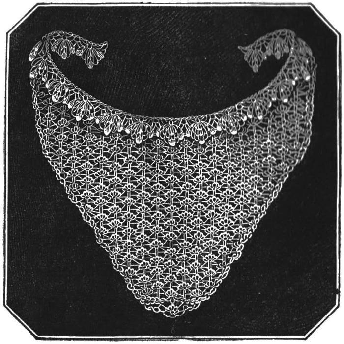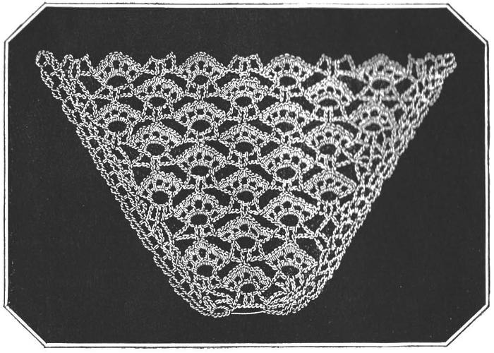 8th.—Work as the 14th row; end with miss 3, 1 plain, 3 chain, miss 5, and edge: repeat these 8 rows twice more, working 1 pattern less each repeat. Then work 50 chain stitches,[30] turn, and on the chain stitches work 50 plain and along the neck work 5 chain, and 1 plain, in the 2 chain at the beginning and end of the rows, repeating to the other point, and at the end work 50 chain to correspond with the other side.