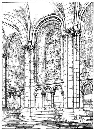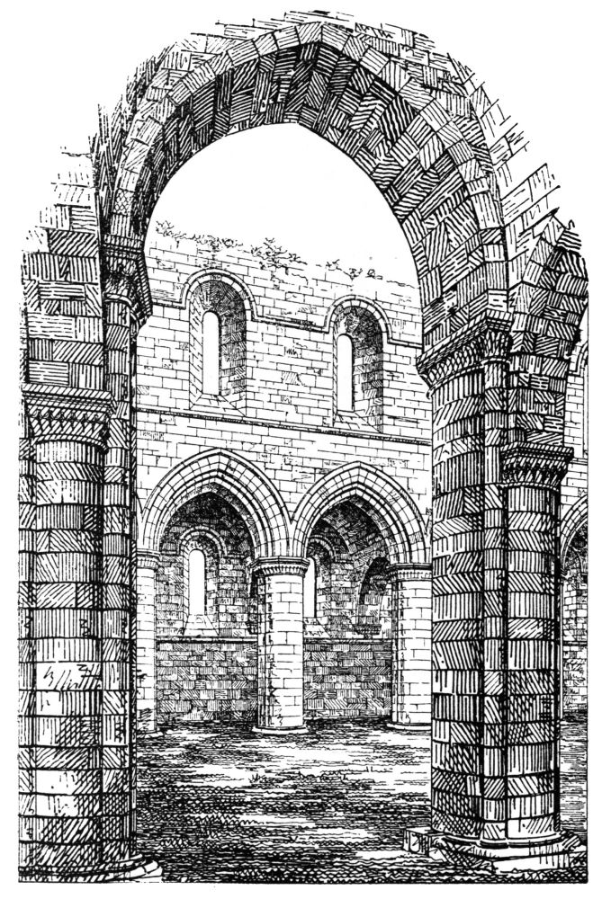 [5] I do not know whether the western bays of the Church of S. Pierre, adjoining the Abbey Church at Jumiéges (which bays seem to have belonged to the original chapter-house), belong to the older building destroyed by the Normans, or to that rebuilt in 930 by Guillaume Longue-Epeé. They are in style not Norman, but refined “Primitive Romanesque.” (G. G. S. 1878.)