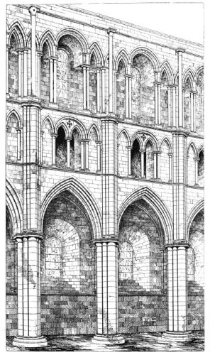 [28] This work at Chichester was executed at the close of the century, after the fire of 1186; but Professor Willis has shown that some early Pointed work of a very marked character, which exists in the western part of the Lady Chapel, must have been erected previously to that event.