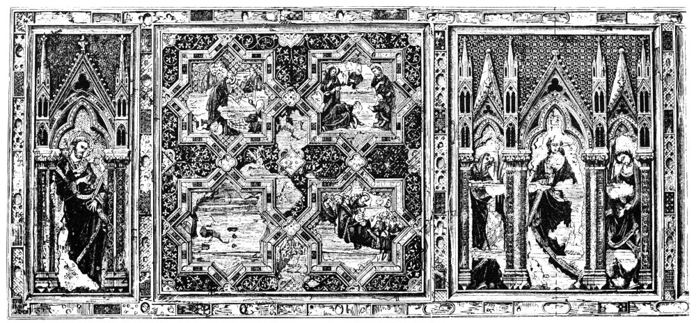 [49] Much discussion has taken place as to who this Pietro—“Petrus Romanus Civis”—was. Virtue, as quoted by Walpole, says it was Pietro Cavallini, but he was only a child when this work was done. The ciforium in the Church of St. Paul without the Walls bears this inscription; †HOC OPUS FECIT ARNOLFUS CUM SUO SOCIO PETRO!! Monsegnor Xavier Barbier de Montault, who wrote a chapter for Mr. Parker’s work on Rome, says that this was Pietro Cavallini. If so, he was probably the father of the more celebrated artist. The date of the work last named is 1285, being sixteen years later than that at Westminster.