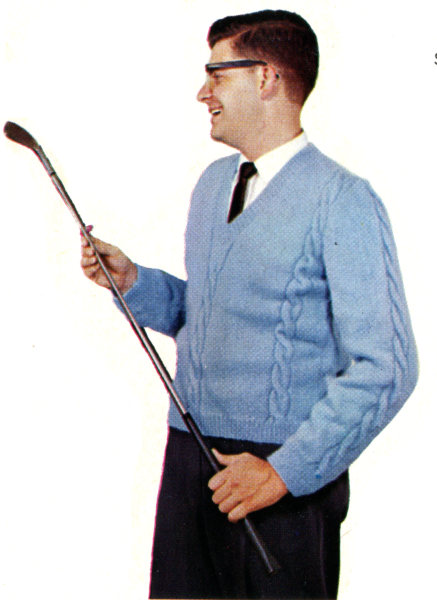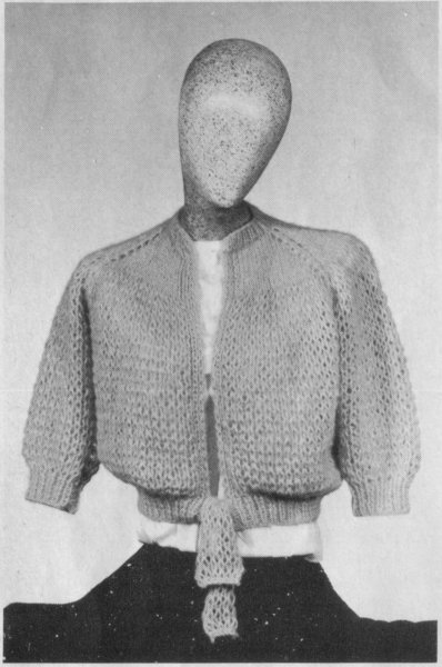 TIES: From right side, with No. 9 needles, pick up and k 8 sts on side of right front waistband. Work in ribbing of k 1, p 1 for 2′′, end on wrong side. Change to No. 10½ needles. Work in pat st for 12 rows, end on p row. Bind off loosely in k. Make tie on side of left front waistband in same way. Weave underarm and sleeve seam.