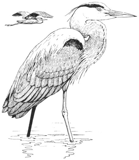 Altho protected by the Federal Migratory Bird Treaty, this heron often finds himself the target for thoughtless hunters. Not that he would make a tasty dish, but any bird which stands 4 feet high with a wing spread of almost 70 inches is in constant danger. His favorite feeding grounds are wet meadows or pastures, ponds, lakes or streams. Most of his food consists of rough fish which he catches expertly, either standing patiently in shallow water until a fish appears, or walking slowly along the edge of some shallow pond until he discovers his prey. Snakes, frogs, insects, mice, eels, or even small birds are not safe from a hungry heron.