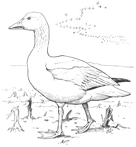 This medium-size goose is the most abundant member of the family and can be identified by white plumage and black wing tips. He is often called “wavy,” in the northern part of his range, while southern hunters refer to him as a “white brant.” His Latin name describes him as “a goose beyond the north wind.” We see him only as a migrant, either going to nesting grounds in Northern Canada or returning to his winter home on the coast of Louisiana and Texas. A somewhat larger relative known as the Greater Snow Goose, nests in Northern Greenland and winters along our Atlantic coast.