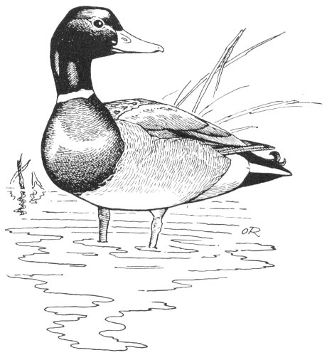 The Mallard drake with green head, purple chestnut breast, reddish feet, white collar, black and white tail with a curled feather, combine to make a colorful duck. The female, more in keeping with her motherly duties, is content to wear a trim suit of buffy gray, streaked with brown. The orange to greenish-olive bill and pale orange-red feet give perfect clues to her identity.