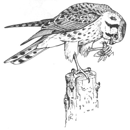 This little falcon, about the size of a Robin, is also known as Kestrel. Calling him a Sparrow-hawk is misleading, for insects and spiders, along with a generous portion of mice, go to make up his daily fare. Grasshoppers seem to be a special delicacy. Like other birds, he feeds on whatever is available. In cities, this includes English Sparrows.