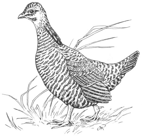 Those who live near prairies and brushy grasslands have a chance to become acquainted with this brown hen-like bird which formerly ranged over much of the middle west. Cultivation and hunters have reduced the numbers until they no longer are common. The large size, the short, dark, rounded tail, the heavily barred underparts, the rounded wings, all are descriptive of this bird. In flight he reminds you of king-size Meadow Larks, flapping then sailing, as he journeys to and from favorite feeding grounds.