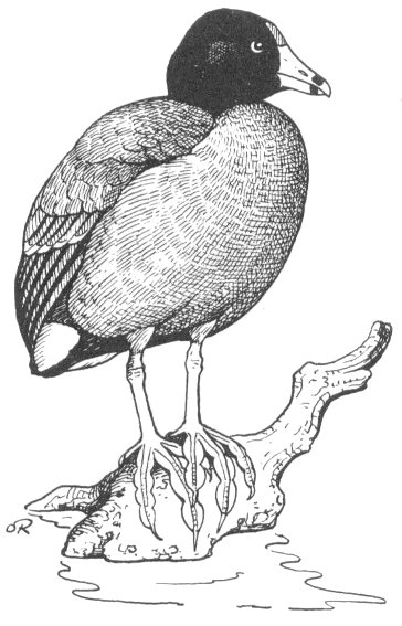 Coots feed largely on underwater vegetation and prefer algae or musk grass. Small fish or other aquatic animals are eaten on occasion while grass, grain or weeds are not overlooked. When diving for food, these birds often are robbed by the American Widgeon, or Baldpate, which relishes such juicy morsels but does not dive. Coots take such invasions as a matter of course.