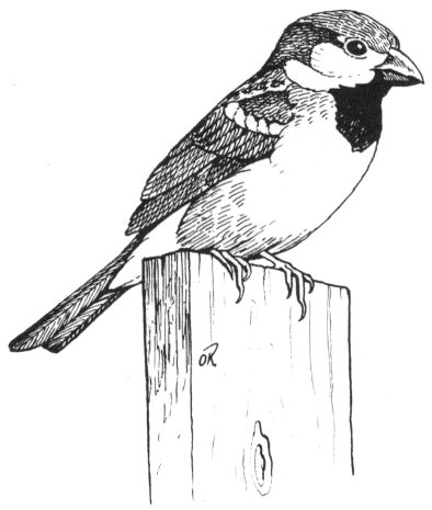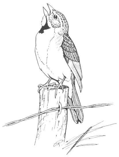 This sparrow-size finch is not too easy to describe for plumage varies. There is no doubt about the singing male for he gets his name from his song and reminds you every few seconds that he is a Dickcissel. He shows a yellow breast with a black spot and except for size resembles a meadowlark. Telephone wires, fences or weeds offer good perches and there you will find him with head back and tail hanging down as he repeats his song. A reddish-brown wing patch is a good field mark in some seasons. The female is much like the female English Sparrow but is lighter with a tinge of yellow and a lighter eye-line.
