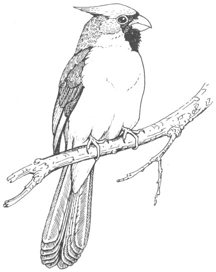 Most folks call him a “redbird,” which is only natural. The male is entirely red except for the black face. No other redbird shows a tuft or has such a heavy, orange bill. The female is dressed more in keeping with family duties for yellowish-brown plumage offers more protection to her and the secluded nest. She always shows a reddish tinge especially on the crest, wings and tail. These markings combined with the conical reddish beak, leave little doubt as to identity. The young resemble the female.