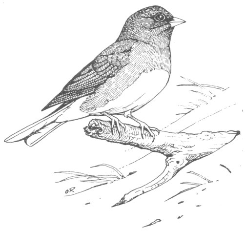 The sparrow-size Slate-colored Junco or the “snowbird,” as he frequently is called, is only a winter visitor in most areas. But what a welcome guest he is! The white belly and outer tail feathers add distinctive marks to his slate-gray plumage. The bill is pinkish white. Females and immature birds are duller and sometimes show a pinkish-brown tinge on their backs and sides.