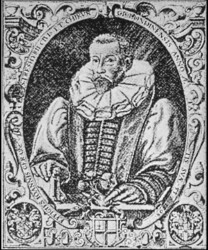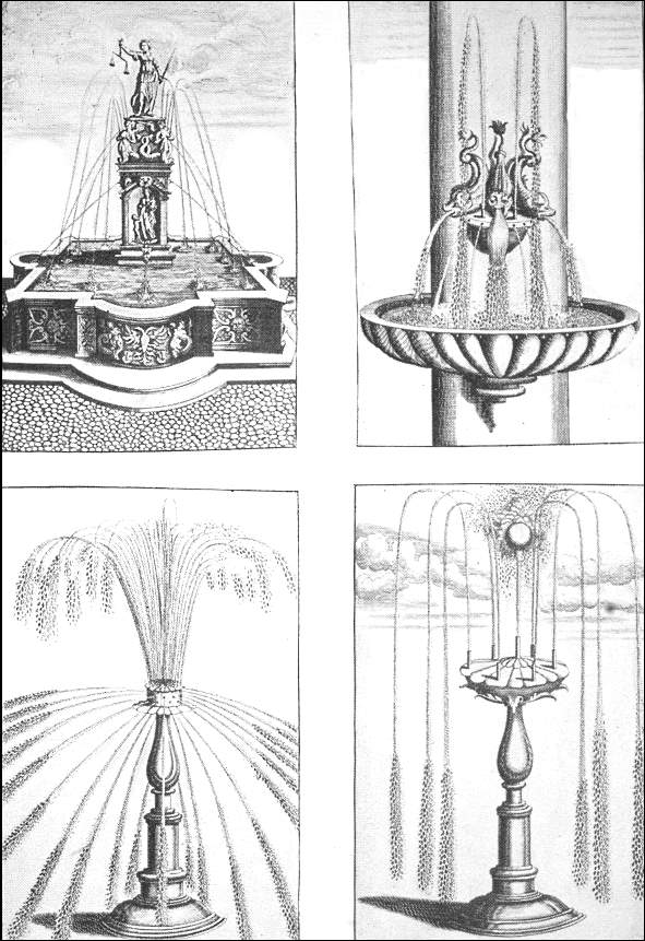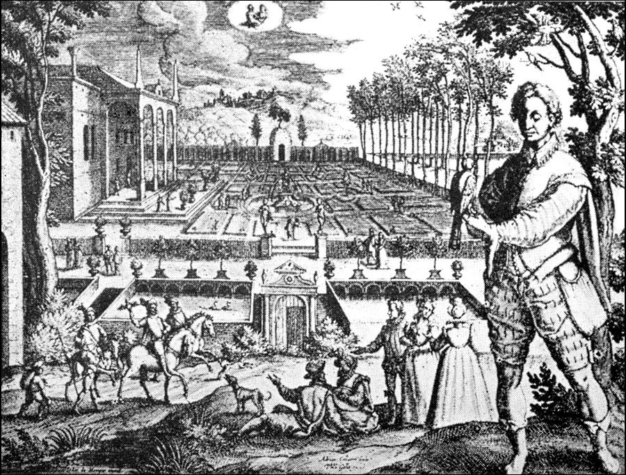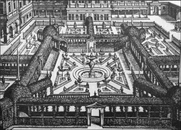 "When the Dance ended, the loud music sounded. The curtains being drawn was seen a Garden of a glorious and strange beauty, cast into four Quarters with a cross-walk and alleys compassing each Quarter. In the middle of the cross-walk stood a goodly Fountain, raised on four columns of silver. On the tops whereof strode four statues of silver which supported a bowl in circuit containing four and twenty foot and was raised from the ground nine foot in height, in the middle whereof, upon scrolls of silver and gold, was placed a globe garnished with four golden mask heads, out of which issued water into the bowl; above stood a golden Neptune, in height three foot, holding in his hand a trident.