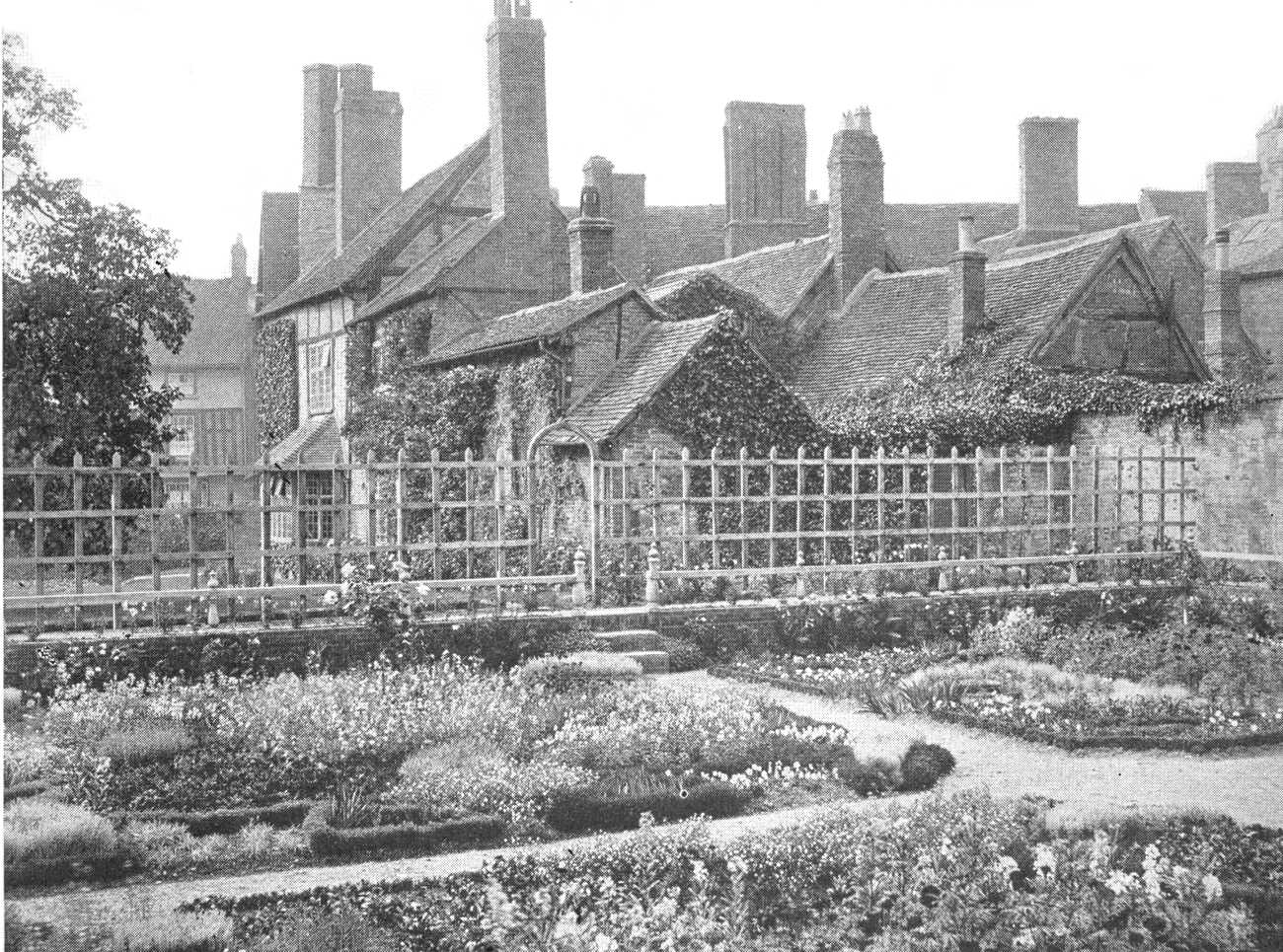 "In one point the Trustees have been able to 'go one better' than Shakespeare in his own 'curious knotted garden'—to use his own expression in 'Love's Labour's Lost.' For neither King James, nor his Queen, Anne of Denmark, nor Henry Prince of Wales sent him—so far as we know—any flowers for his garden. On his 356th birthday, however, there will be planted four old-fashioned English rose-trees—one in the center of each of the four 'knotted' beds—from King George, Queen Mary, Queen Alexandra, and the Prince of Wales. Surely Shakespeare, could he have known it, would have been touched by this tribute!