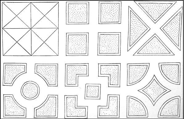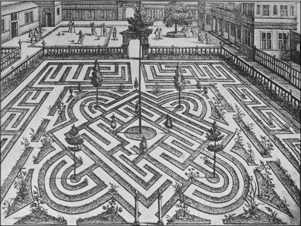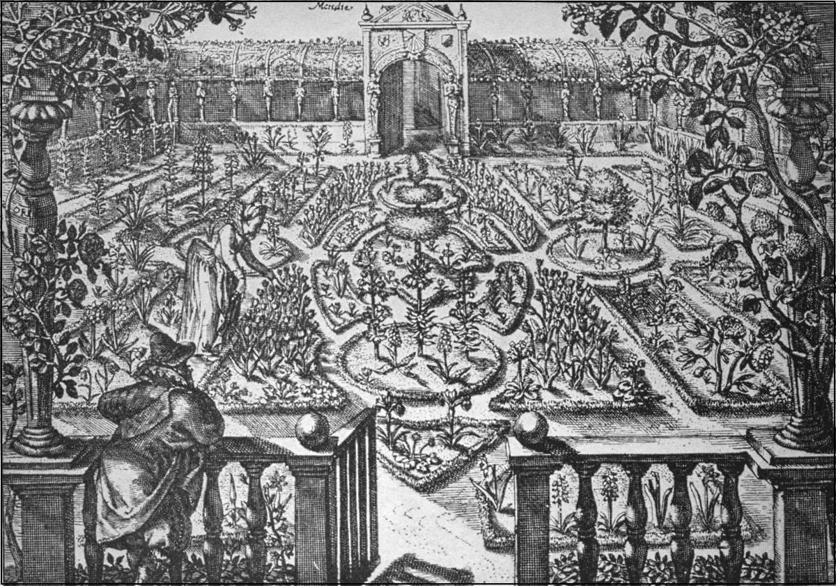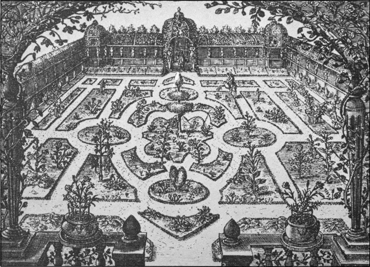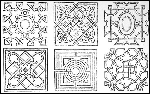 "Every Quarter of the Garden was finely hedged about with a low hedge of cypress and juniper; the Knots within set with artificial flowers. In the two first Quarters were two Pyramids, garnished with gold and silver and glittering with transparent lights resembling carbuncles, sapphires and rubies.