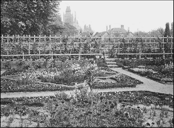 "The beds ranging with these, on the other side of the gravel walk, are at present entirely occupied with spring flowers—largely gifts, like the others, from contributors all over the kingdom. In the summer they will be furnished with the low-growing flowers known to the gardeners of the early years of James the First's reign—carnations, 'our streaked gillyvors,' pansies, stocks, fox-gloves, sweet-williams, snapdragons, and so on....