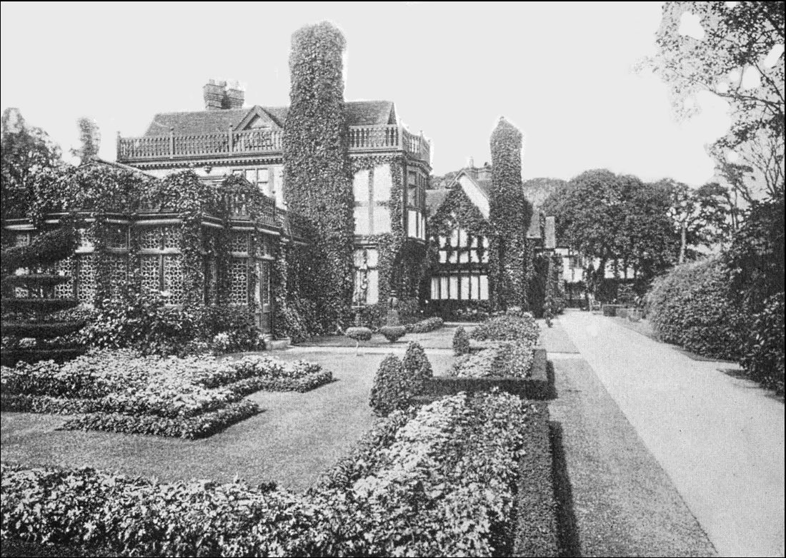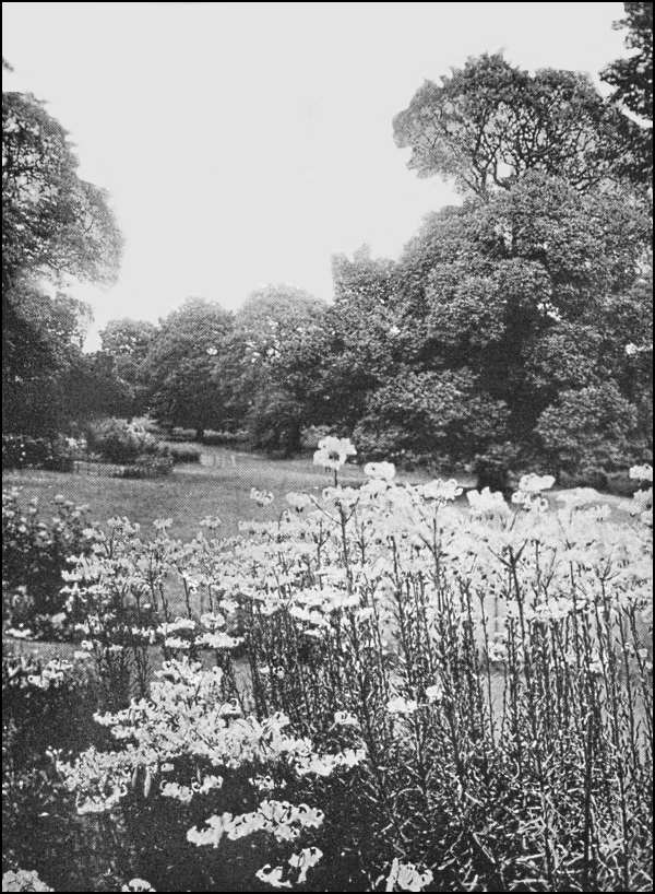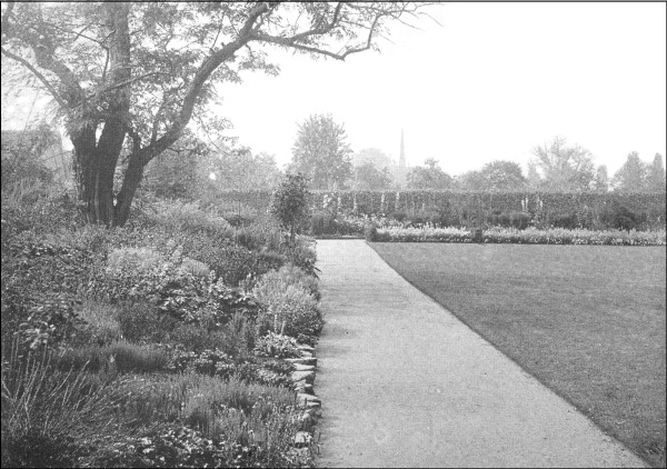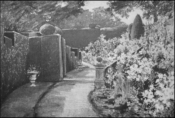 "The first step was to lay out the long, narrow strip of ground by the side of the wall parallel with Chapel Lane as a border for summer and autumn flowers—hollyhocks, canterbury-bells, lupins, larkspurs, crown imperials, lilies, and so on. As a background for these—and also to hide the ugly, cast-iron railings that disfigure the top of the wall—there was planted a row of yew trees. This border of some 300 feet long has been treated in the formal fashion of the olden time ... being divided into compartments, separated by 'buttresses' supporting 'pillars' or 'columns' surmounted by 'balls.'