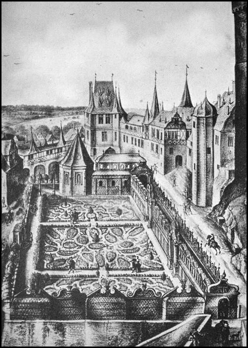 "At the farther end of the Garden was a Mount, raised by degrees resembling banks of earth covered with grass. On the top of the Mount stood a goodly Arbor, substantially made and covered with artificial trees and with arbor flowers such as eglantine, honeysuckles and the like. The Arbor was in length three and thirty foot, in height one and twenty, supported with termes of gold and silver. It was divided into six arches and three doors answerable to the three walks of the Garden.