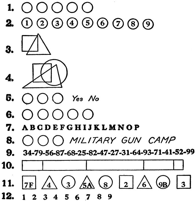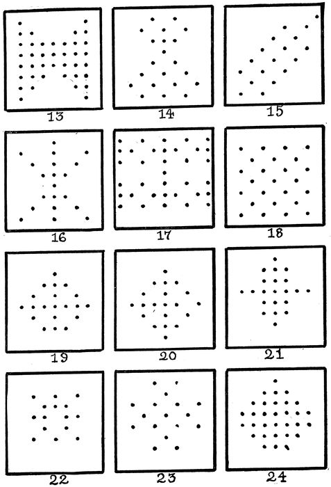 Here again, the only way of giving the correct solution of each problem is by means of the transparent stencil furnished with each package of test blanks. That dot which can be “cut out” and still leave a perfectly symmetrical figure is the one which should be circled in each pattern. This is frequently at the very centre of the pattern, although the centre is not the correct one if by removing it the pattern is left unsymmetrical.