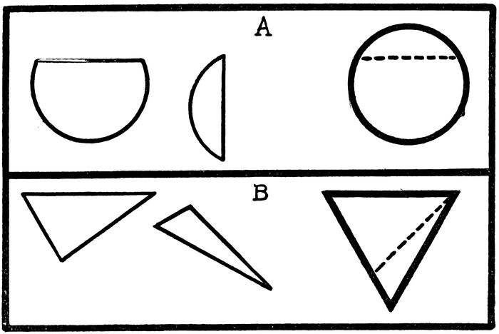 Only a transparent stencil can give a clear impression of the correct solution of each figure. In dividing a circle into two equal parts it makes no difference in what direction the diameter is run—in other words, any correct solution should be accepted and given full credit.