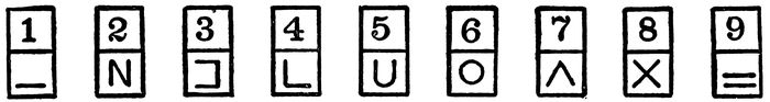 The reader may, by reference to the Key printed at the top of the test sheet, determine for himself the correctness of any symbol written by a candidate. The stencil furnished with the Test Blanks makes it possible for one to score this test very accurately with a very small expenditure of time and effort. In scoring this test with the stencil the correctness of the entire list of 100 characters can be checked in less than a minute by an ordinary clerk.