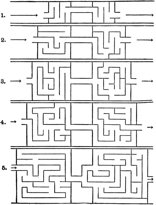 No list of correct answers can be printed for this test. The stencil provided with the test blanks shows exactly what the correct and most economical threading of each maze is, but the reader can find this solution for himself if he will take the time and make the effort. No credit should be given for any maze not completely traced or for any maze in which a printed line has been crossed. A candidate who has gotten into a “blind alley” but has retraced his way and ultimately been successful in getting through the maze should have full credit for that particular maze.
