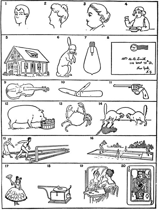 No attempt has been made to print here an exhaustive list of correct answers to each question. The answers printed as correct are merely typical in most cases of the quality of replies that should be accepted. Anything as appropriate as or more appropriate than the printed answer may be given full credit, while anything less satisfactory is to be given no credit at all. To print here all of the correct answers to each question would take more pages than can be allowed for this section of the Appendix and would in many cases cause more confusion than clearness of thought. It is suggested that any question of right or wrong answers which is difficult to decide should be settled arbitrarily by the 333reader and that a note be kept of just how the matter was decided, in order that any later investigator may have the benefit of his judgment. In some of the tests new solutions will continually be appearing, even after it seems certain that all of the correct answers have been found and catalogued.