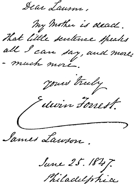 The day after the burial, one of the papers said, "The funeral of the mother of Edwin Forrest, the great American tragedian, took place yesterday. She was buried in St. Paul's churchyard. The emotions of the actor on taking his last look at the parent who had always loved and cherished him so tenderly were far more keen than any he had ever feigned on the stage. We regard the mother of a man of fame and genius with an involuntary feeling of reverence. We think of her care and tutoring of her child in his earliest years."