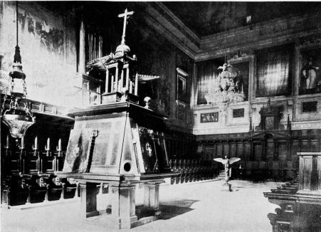 In 1586 the king was busy with preparations for the ceremony of consecrating the church of the Escorial, which had been completed some time previously. During the erection of the church, services were held in a temporary structure, and in this building there was a celebration of the mass before the procession{15} entered the new church. Philip, the prince, and several great clerics supported the canopy which was carried in the solemn pageant. The temporary church, which stood in the hamlet, was afterwards reconstructed, and placed at the service of the people.