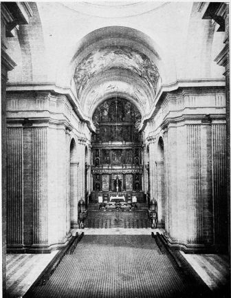 In accordance with his father’s wishes, Philip III. began to build the present burial-vaults soon after his accession to the throne. He did not live to see the completion of the work, which was continued during the reign of Philip IV. The construction was, however, delayed through the attitude of the overseer of the works, who objected to the expenditure of so large a sum of money from the national exchequer; but under the monk Nicolas, the Panteon was at length made ready, in 1654, for the reception of the coffins of members of the royal families.{18}