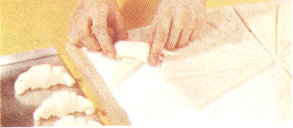 Roll dough into 12″ circle. Cut into 16 wedges. Beginning at wide side roll toward point. Place on greased baking sheet with point underneath.