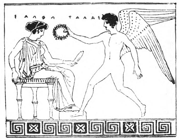 On a Greek vase in Bologna. Reproduced from Pellegrini, Catalogo dei Vasi Greci dipinti delle Necropoli Felsinee, Fig. 77