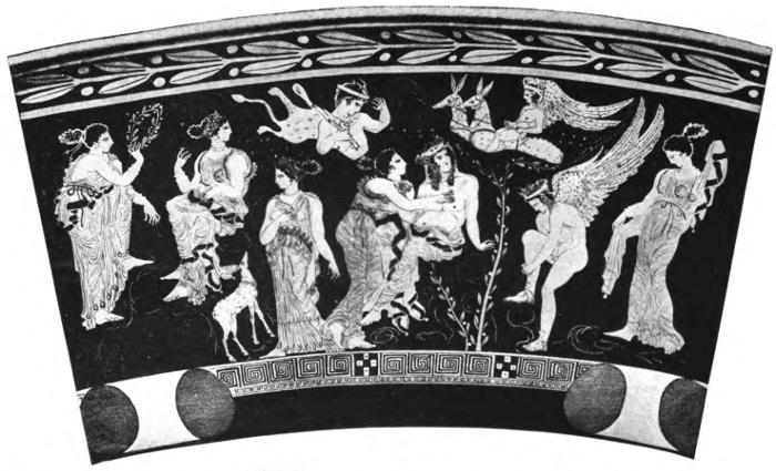 In the style of the Meidias painter, in the Jatta collection at Ruvo, representing Thamyris giving a musical recital in the presence of Apollo, Aphrodite, and the Muses, among whom Sappho is included. Reproduced from Römische Mitteilungen, III, 1888, pl. IX