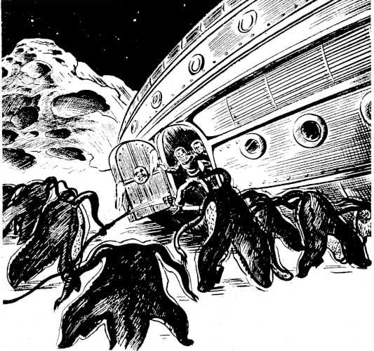 The beings wore metal mesh belts twined into the spines on their legs, and these supported cases for what were probably tools and weapons. Their "hands" were empty; evidently they did not fear an attempted escape or attack on the doctor's part. They made no sound except for the dry rustle of their spiny armor as they moved. In silence they closed in around Little, while one waved his flexible arms toward one end of the passageway. A gentle shove from behind, as the doctor faced in the indicated direction, transmitted the necessary command, and the group marched toward the bow. Two of the silent things stalked in front, two brought up the rear; and at the first opportunity, the other swarmed up one of the radial ladders and continued his journey directly over Little's head, swinging along by the handholds on the central beam.