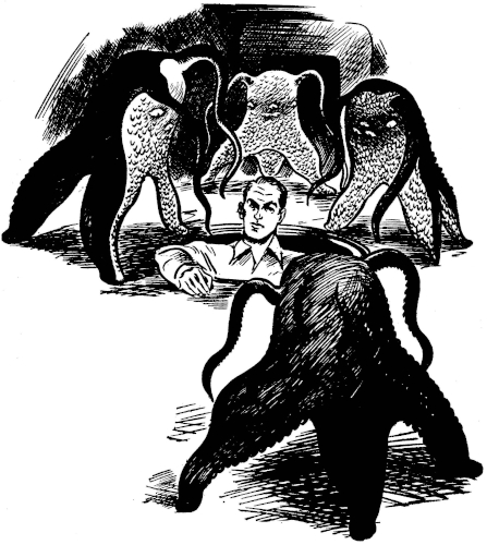 "When I have stopped talking, each of you count thirty, slowly, meanwhile working your way toward the handiest tool or weapon in the neighborhood. When you reach thirty, dive for the object of your choice and do your best to get to that forest. You have all, except the doctor, had some experience of the rough-and-tumble tactics of these creatures; the problem, I should say, is to get past them without a fight and into the open. I think we can outrun, on the level, any invertebrate alive. If someone is caught, don't stay to help him; right now, I want to get at least a small crew away from here, where we can work out at our leisure rescue plans for the unlucky ones. Don't all try to get guns; we'll find cutting tools just as useful in the woods. You may start counting."