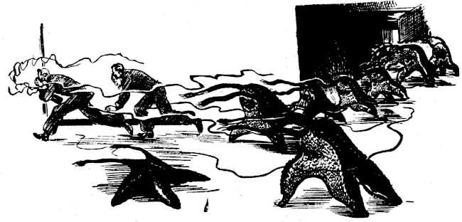 Goldthwaite had been in a bad position, with almost the whole group to fight through on his way to the woods. Apparently he never thought of disobeying orders, and going the other way. He dropped the case he had been trying to lift, seized a bottle from it with each hand and headed into the mêlée. Curiously enough, he was the only one using weapons; the guards, festooned with implements snapped to their leg belts, fought with their bare "hands," and the men all ignored their guns and knives in the effort to run. Most of the pentapods at the sergeant's end of the group were engaged, and he got nearly halfway through the group before he was forced to use his clubs.