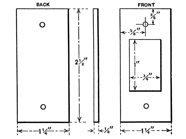 The front of the lamp housing has a hole measuring 1 by ¾ inches cut in it on a level with the lamp filament. Two clips cut from spring brass of the shape shown in the detail drawing are mounted on the front of the box in such a position that when the posts on the back of the cell are slipped into the holes in the ends of the strips the window of the cell will be opposite the opening in the lamp housing. Connection is made to the cell by means of these clips. [Pg 35]