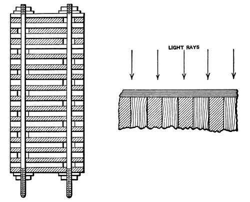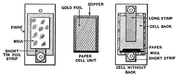 The Fritts Cell is little known except by name but is superior to the others both in simplicity of construction and correctness of design. In this case the selenium is melted directly on a copper plate that serves as one electrode. While soft, pressure is applied by a non-adherent plate to obtain the thin film necessary. The selenium [Pg 17] enters into chemical combination with the copper and adheres firmly to it. After cooling the selenium film is covered with gold leaf to form the other electrode. The cell unit can be mounted between two strips of fibre as shown in Fig. 6, a sheet of very thin mica serving as a protection to the gold foil surface.